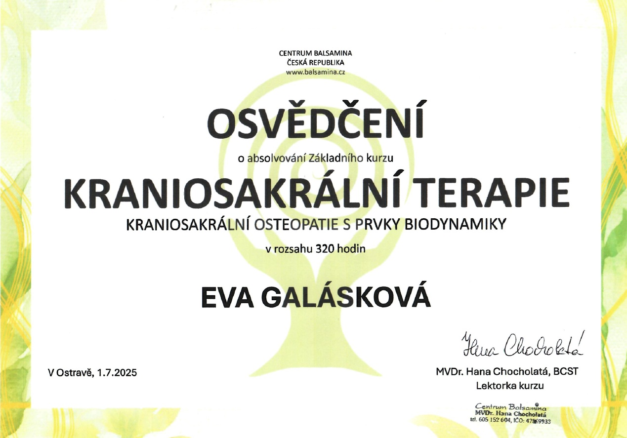 Ve rok a půl dlouhém výcviku jsem se naučila dovednosti Kraniosakrální terapie a pomáhám lidem uvolnit jejich bolesti. Chtěla bych, abyste se o této terapii dozvěděli a vyzkoušeli jí. Je mým přáním šířit co nejvíc informace o kraniu.